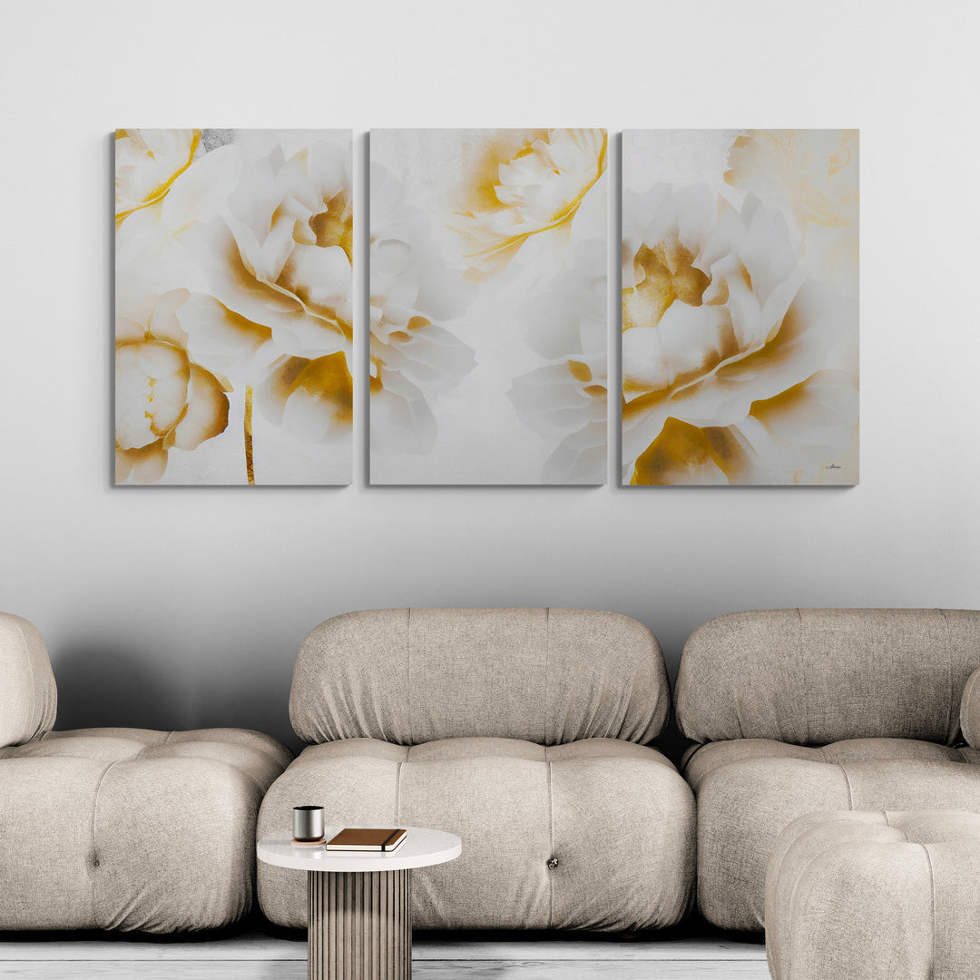 Ce triptyque floral joue avec la lumière et la transparence pour sublimer la beauté des pétales en blanc soyeux et reflets dorés. L’ensemble dégage une sensation de pureté et d’élégance, créant une ambiance douce et lumineuse. C’est un choix idéal pour apporter fraîcheur et raffinement à votre décoration intérieure.