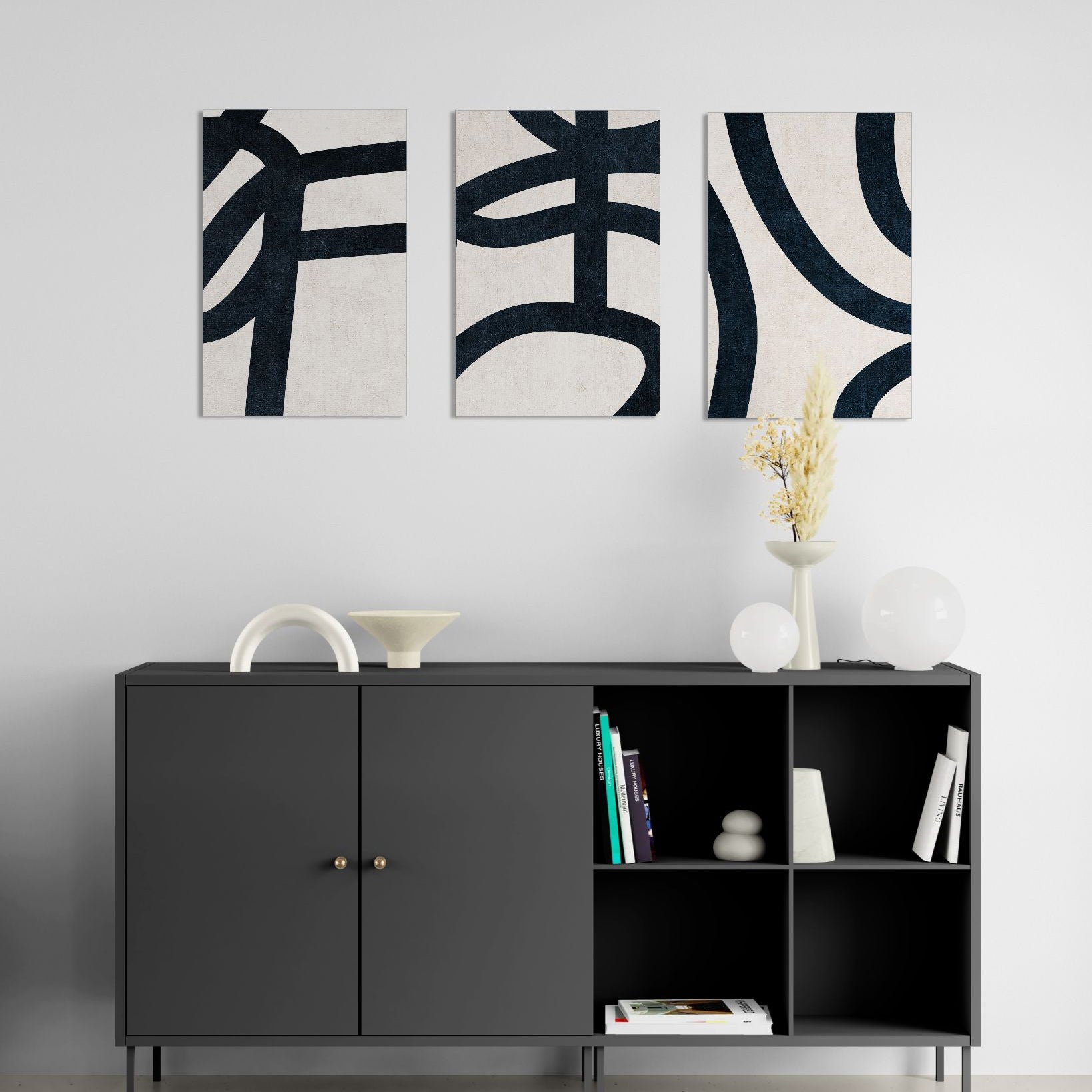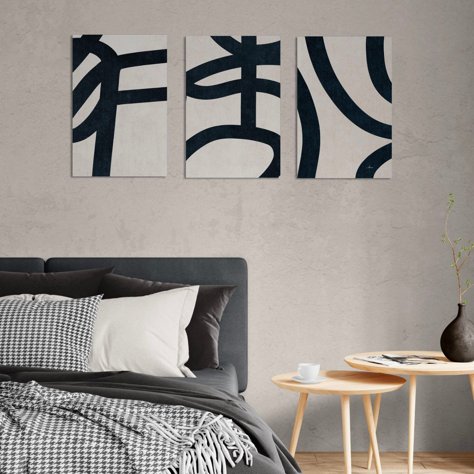 Ce triptyque abstrait joue avec les lignes audacieuses et les courbes organiques pour créer un rythme visuel saisissant. Le contraste entre les tracés noirs profonds et le fond beige texturé apporte un équilibre parfait entre force graphique et sobriété. Il s’inscrit parfaitement dans une décoration moderne, minimaliste ou inspirée du style japandi.