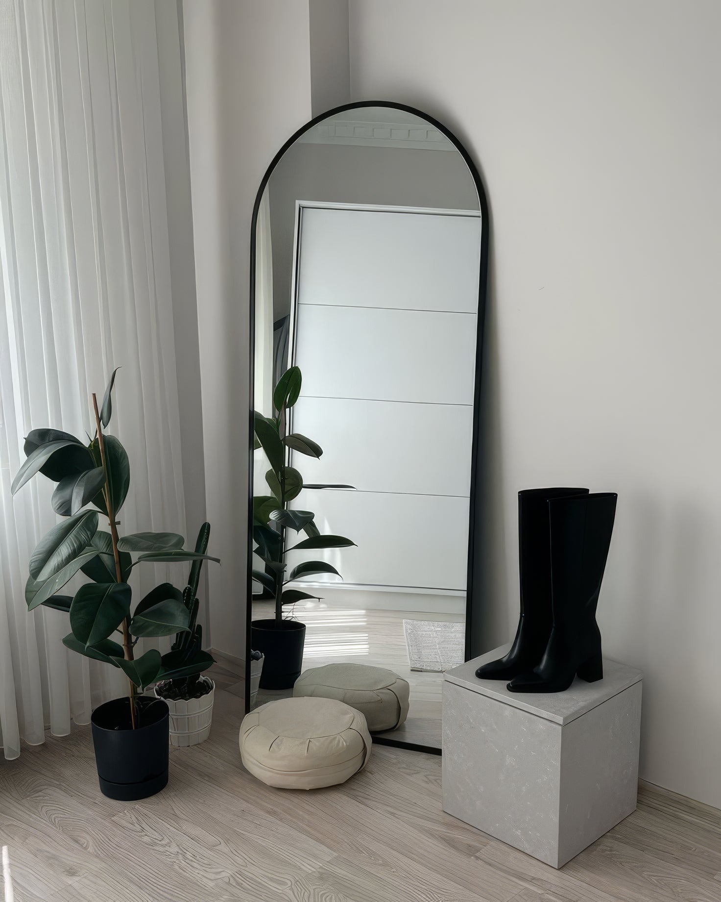 Le miroir Arche Noir Élégance 180 se distingue par sa forme arquée élégante et son design contemporain. Il peut être utilisé en miroir mural ou posé directement au sol, offrant une grande liberté d’aménagement et une touche décorative raffinée à tout type d’intérieur.