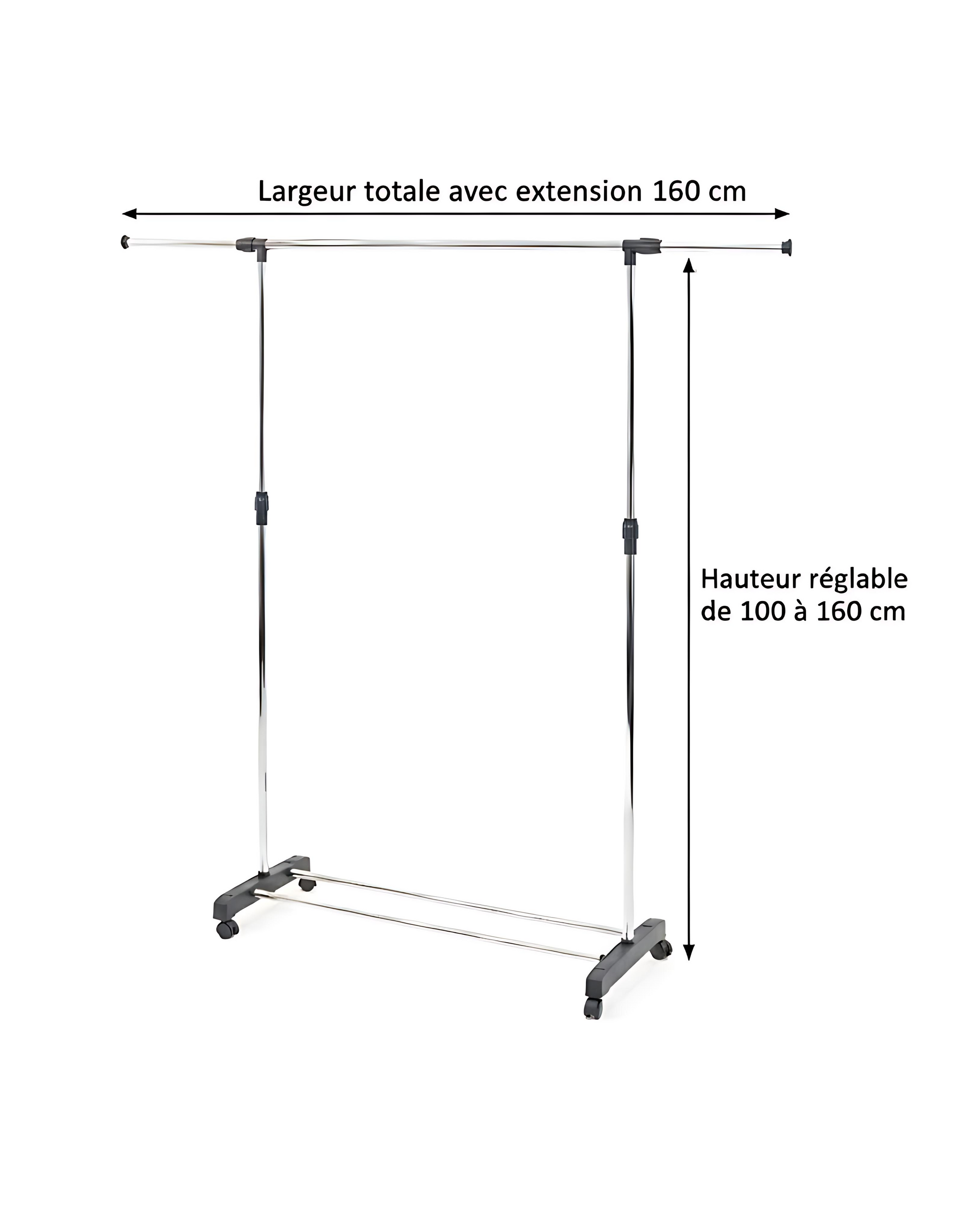 Ce portant extensible en métal galvanisé argenté offre une solution pratique et élégante pour organiser vos vêtements Sa tringle réglable en hauteur de 100 à 160 cm et ses barres extensibles jusqu’à 40 cm permettent d’ajuster la capacité selon vos besoins Compact stable et fonctionnel il s’intègre facilement dans une chambre un dressing ou un espace professionnel