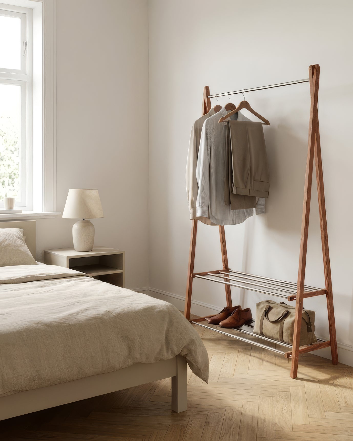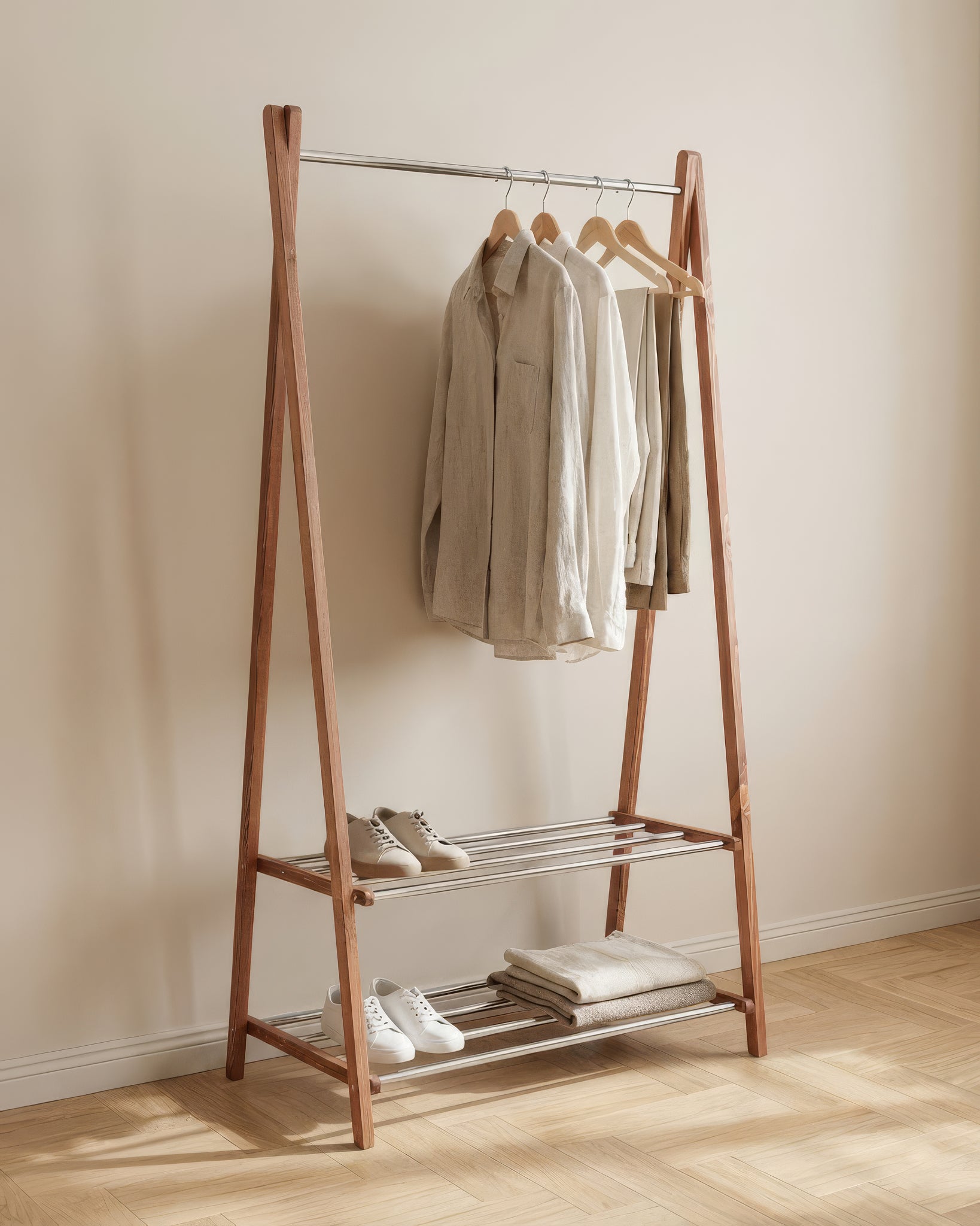 Portant pliable en bois rouge massif et acier inoxydable chromé offrant une solution de rangement élégante et fonctionnelle. Son design épuré s’intègre parfaitement dans un salon ou une chambre à coucher tout en apportant une touche moderne et structurée à l’espace.