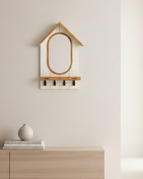 Conçu en MDF avec une finition soignée, il intègre un miroir décoratif, une petite tablette pratique et 4 crochets résistants, parfaits pour organiser clés et accessoires du quotidien.