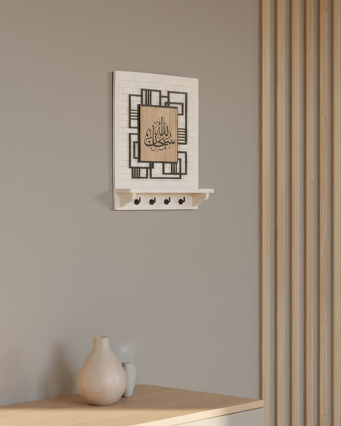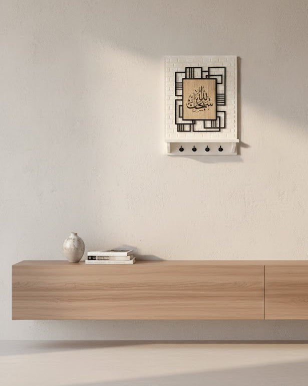 Ce porte-clés mural décoratif met en valeur une élégante calligraphie “Sobhan Allah” découpée sur panneau en bois, entourée d’un motif géométrique moderne. Son design raffiné apporte une touche spirituelle et décorative à votre intérieur, idéale pour une entrée, un salon ou un espace de passage.