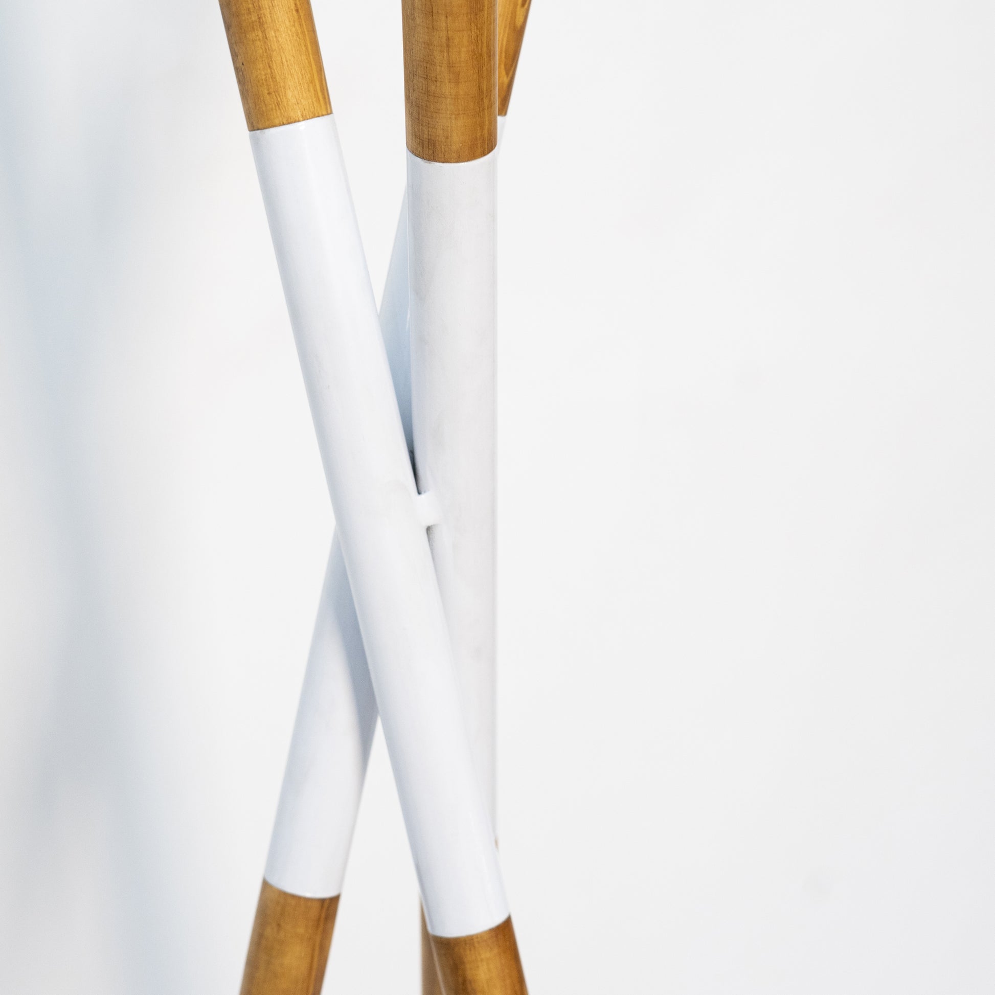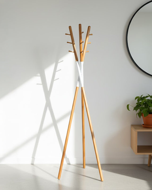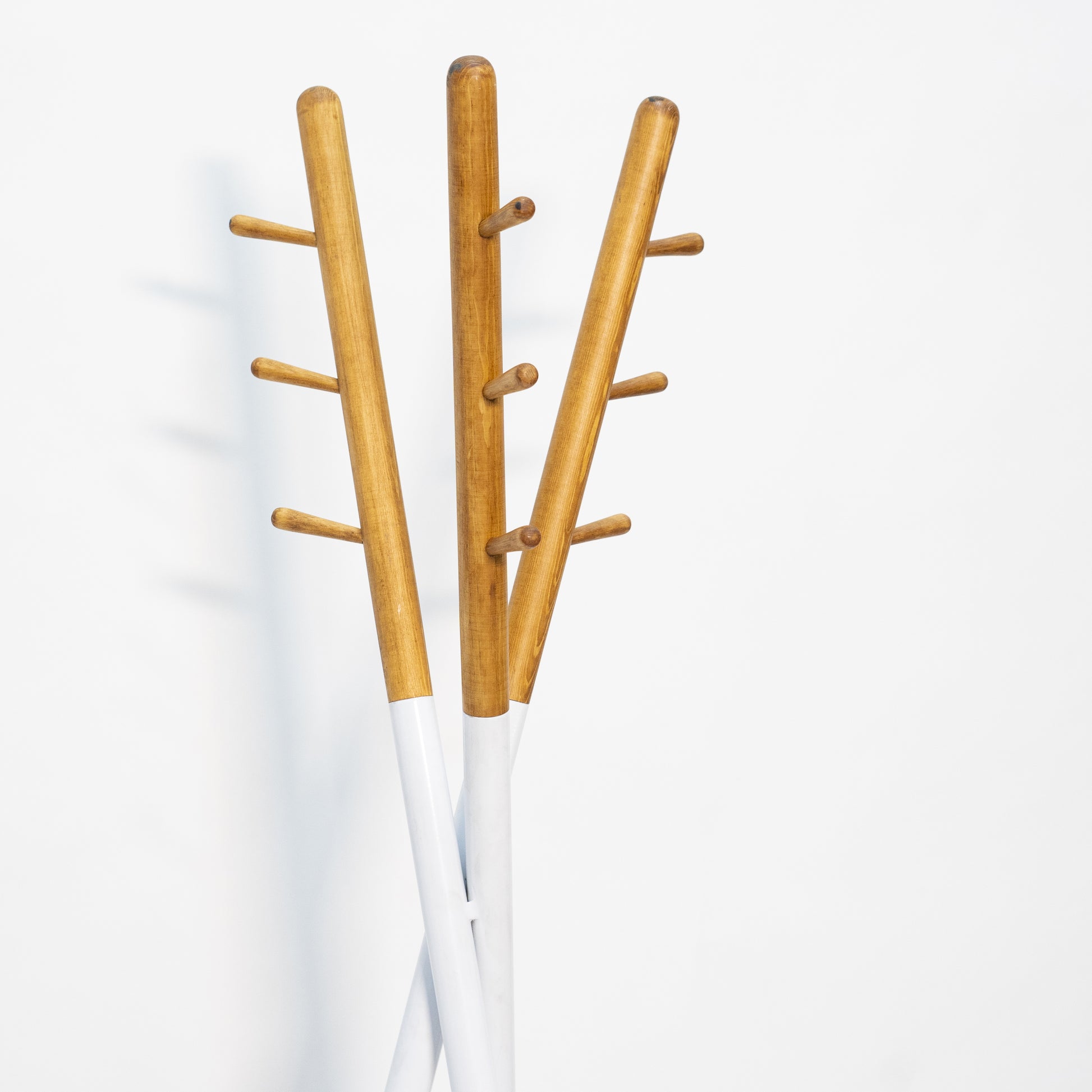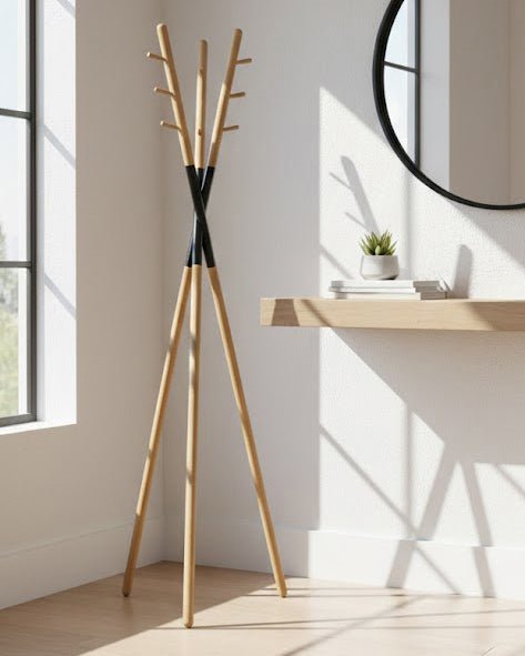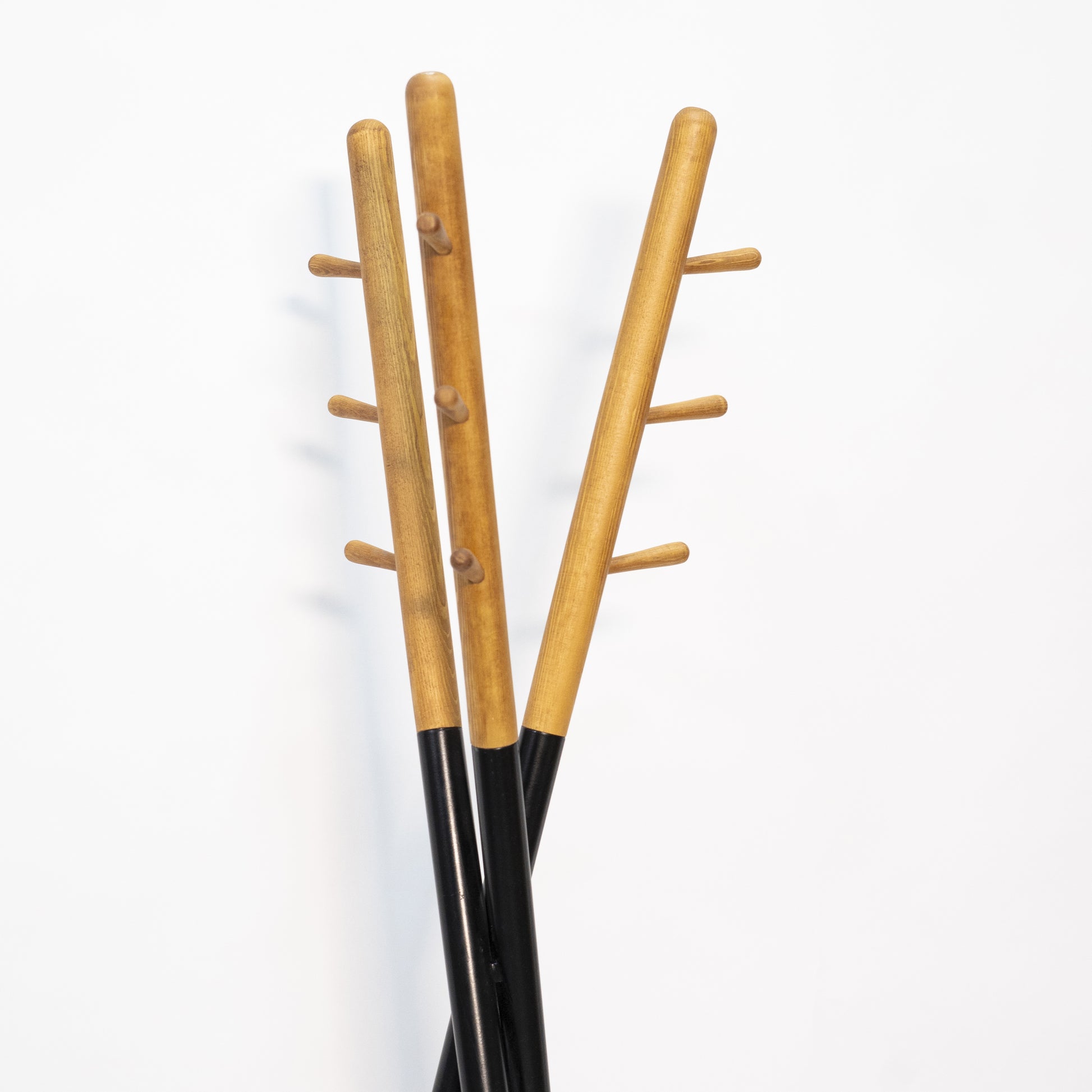 Ce porte-manteau en bois massif rehaussé d’un élégant détail en acier au centre Son style épuré et contemporain s’intègre parfaitement dans une entrée une chambre un bureau ou un hall d’accueil Avec ses trois bras équipés chacun de trois crochets il offre une solution de rangement stable et pratique pour manteaux vestes sacs et accessoires