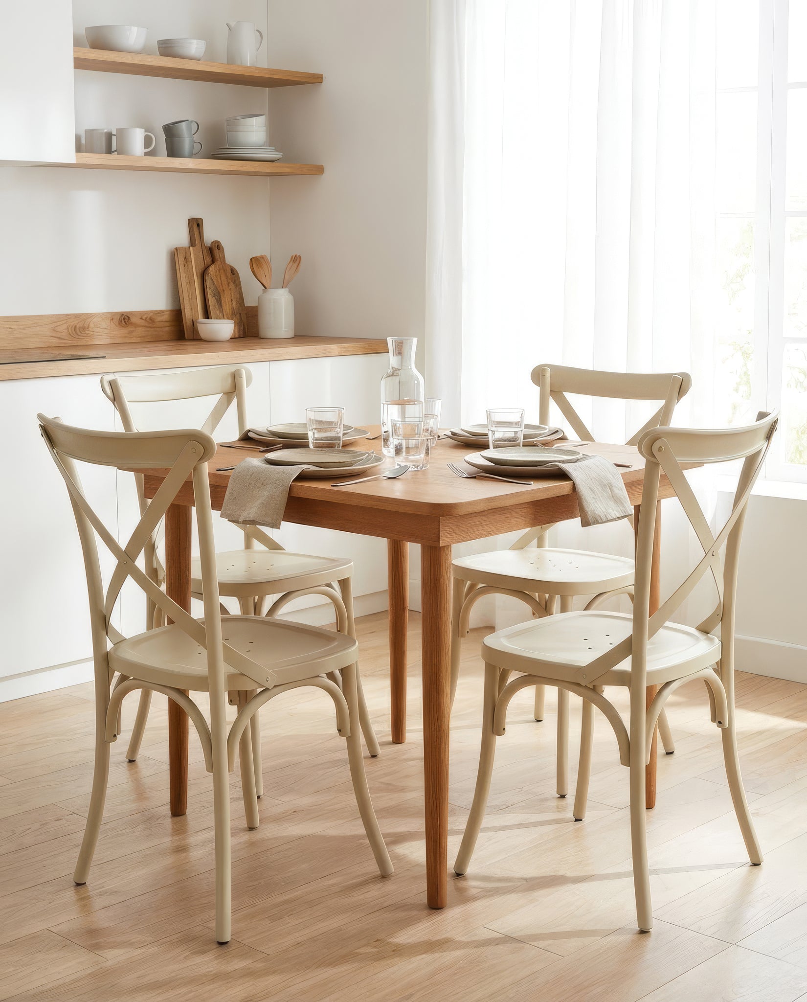 Ce set table scandinave et 4 chaises est conçu pour accueillir confortablement jusqu’à 4 personnes. Son design épuré d’inspiration nordique apporte une touche moderne et chaleureuse à la cuisine ou à la salle à manger. La table se distingue par sa stabilité et ses lignes équilibrées, tandis que les chaises Metallica de la marque Sofpince offrent légèreté, résistance et confort au quotidien. La couleur des chaises est entièrement au choix du client afin de s’adapter parfaitement à chaque intérieur.