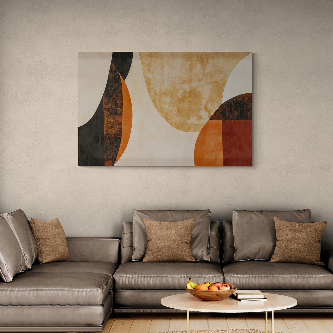 Cette œuvre contemporaine grand format explore la rencontre entre les courbes organiques et les tons terreux profonds. Les nuances de beige, d’ocre, de noir charbon et de terracotta s’entrelacent dans une composition chaleureuse et graphique. Parfaitement centré dans un espace épuré ou élégant, ce tableau crée un point d’ancrage visuel fort sans jamais dominer la pièce.