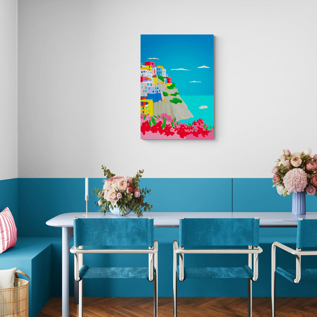 Une falaise plonge dans les eaux turquoise de la Méditerranée, parée de maisons colorées baignées de lumière. "Éclats de l’Italie" capture l’âme vibrante des villages côtiers, entre ciel azur et floraison éclatante. Ce tableau évoque les souvenirs d’été, les ruelles ensoleillées et les escapades en bord de mer.