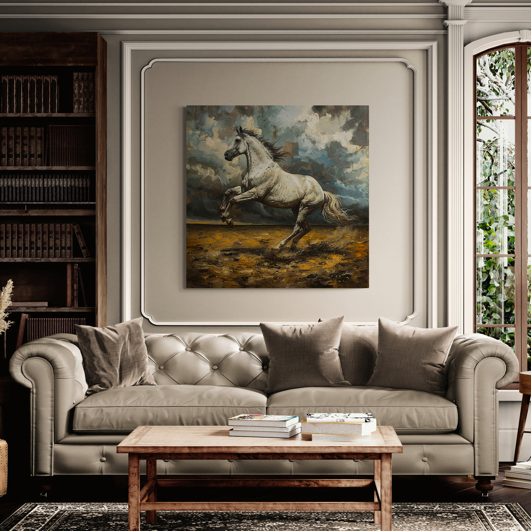 Ce tableau en toile carré capture avec intensité l’instant où un cheval blanc se cabre sous un ciel tourmenté. La posture énergique de l’animal contraste avec les nuances profondes du paysage, mêlant mouvement, tension et élégance. Le sol texturé aux tons ocres souligne la force de la scène et enrichit la composition.